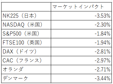 - マーケットインパクト:発表日時のOpen Priceから下落の最大値までの下落率。