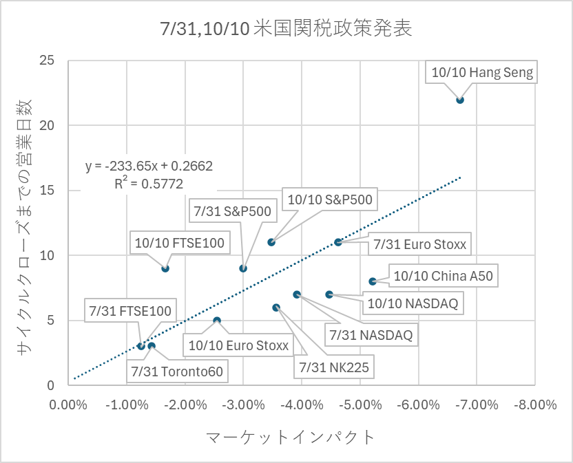 過去事例では、単に需給が自然回復してサイクルクローズしたというよりも、関税の影響を踏まえた米国政府側の追加対応がサイクルクローズの契機になった可能性がある。例えば、10/10の関税発表後に米中首脳会談の調整が進んだケース、4/3の発表後に90日間の猶予措置が示されたケースなど、政策・外交面での方針転換が市場心理を反転させたと解釈できる。従って、本件でも米国政府、特にトランプ大統領の次の発言・方針転換・交渉進展次第では、サイクルクローズが完了する営業日数が前後することを留意しておきたい。