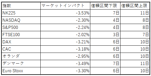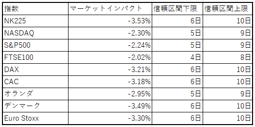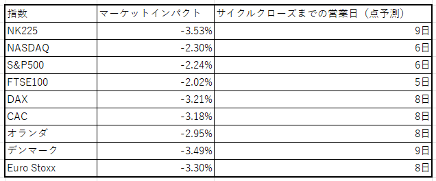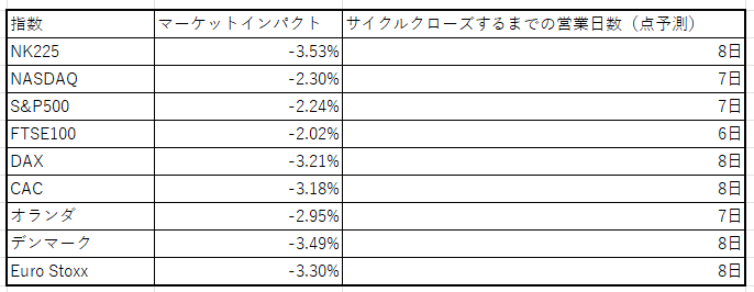 まず、上記回帰式に、今回のマーケットインパクトを代入し、サイクルクローズまでの営業日数を点予測した。点予測とは、先ほど算出した近似直線(y=-233.65x+0.2662)に各指数のマーケットインパクト(例えばNASDAQならx= -2.30%)を代入して計算したものである。点予測結果は以下のとおりである。