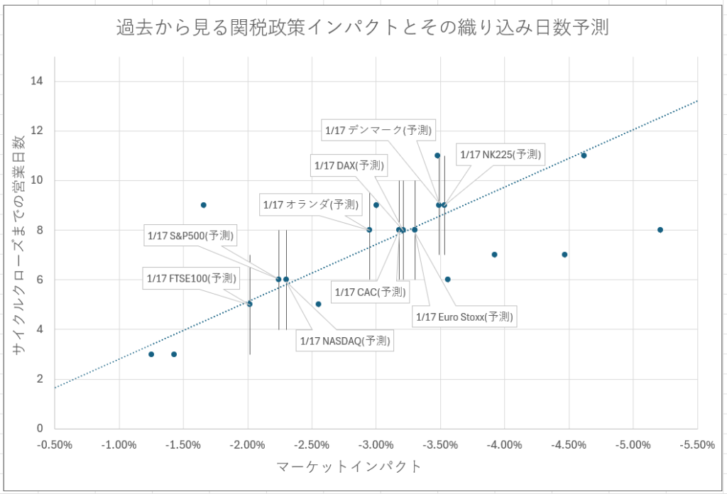 またこれまでの例との大きな相違点として、今回の関税発表は「貿易」論点に加えて、防衛・外交・領土といった地政学的論点を伴うため、織り込みスピード(サイクルクローズまでの日数)が前例より遅延するリスクがある。