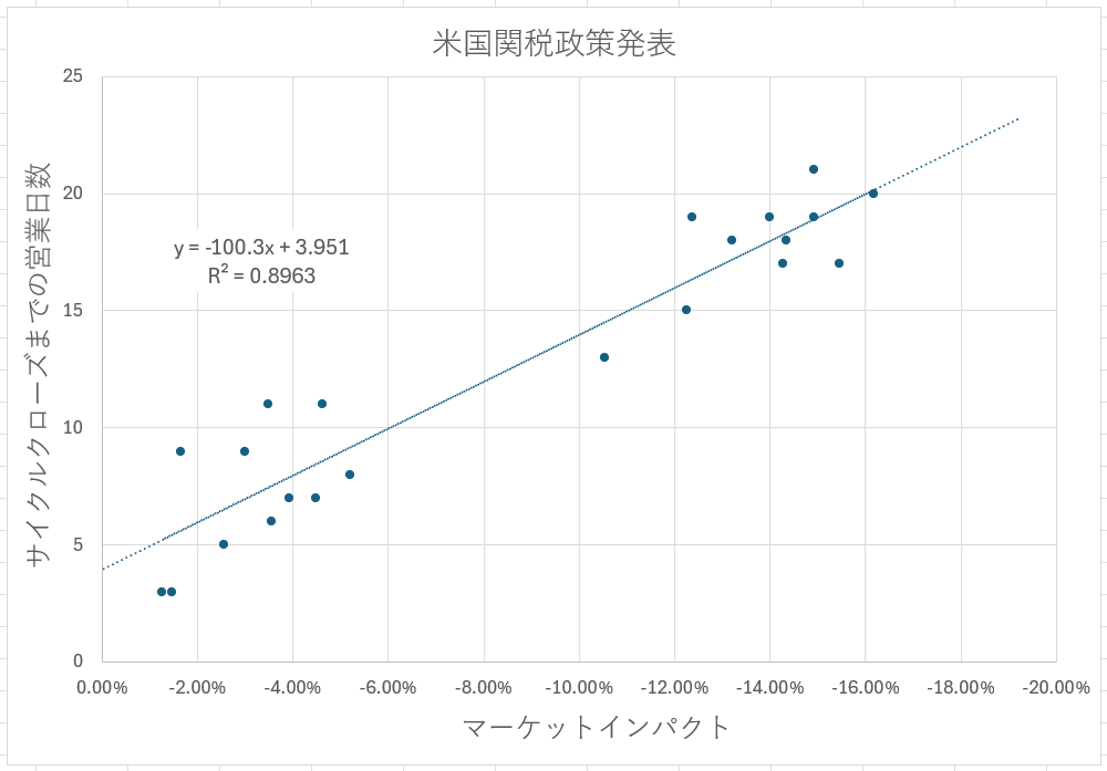 4/3・7/31・10/10の各指数について、マーケットインパクトとサイクルクローズまでの営業日数を整理した結果を散布図化し、最小二乗法で近似直線を推定した結果が以下のグラフである。