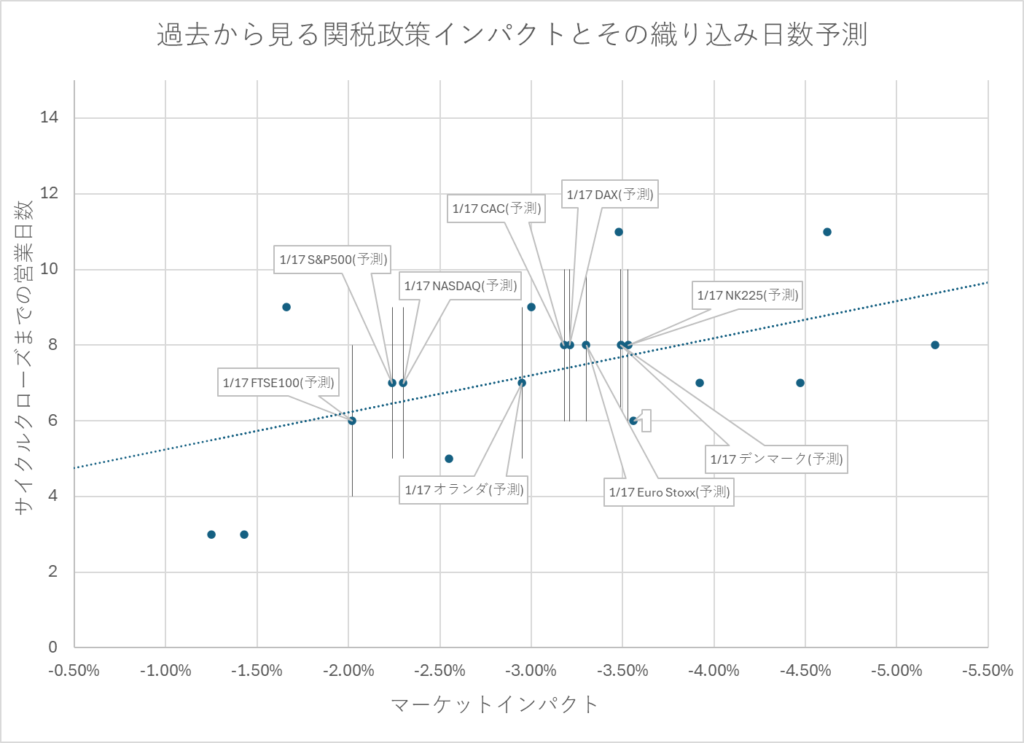以上のデータをもとに、今回のマーケットインパクトに対するサイクルクローズまでの営業日数を推定していく。