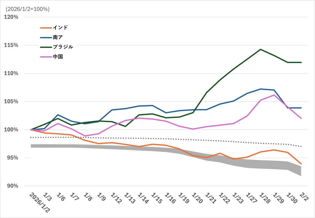 - 現状整理:Nifty 50は1/5に高値を付けて以降、1/30時点で高値から最大 7.67%下落している。一方でBRICS他国は年初来プラスで推移しており、インドの逆行が目立つ。