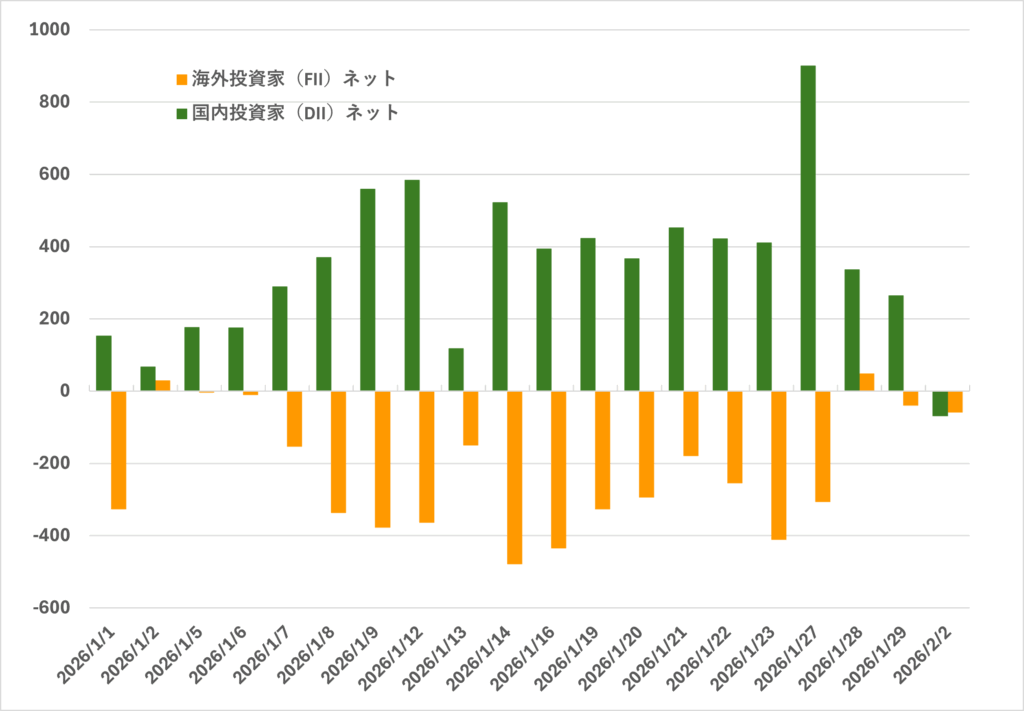 先ほど出てきた【図表4】【図表10】を確認していただければ、足元で海外投資家(FII)の売り越しが目立つ一方、国内投資家(DII)の買い越しが継続していることがわかる。実際、2026年1月下旬時点の年初来集計では、FIIが約4.37兆ルピーを売り越しているのに対し、DIIは約6.98兆ルピーを買い越している。