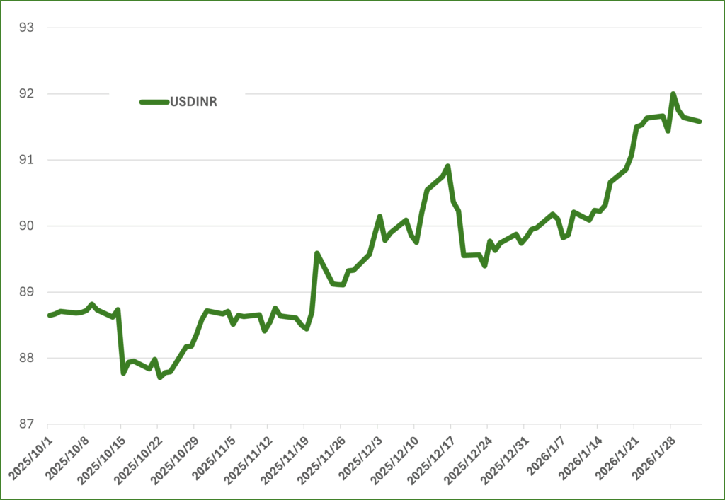 2026年1月以降のNifty 50下落要因の一つはルピー安である。ルピーは昨年12月から通貨安が続いていたが、2026年に入って下落のスピードが増しており、対ドルで史上最安値圏(1ドル=約92ルピー)に接近している。リスクオフと資金流出が重なって下押し圧力が強い。
