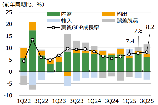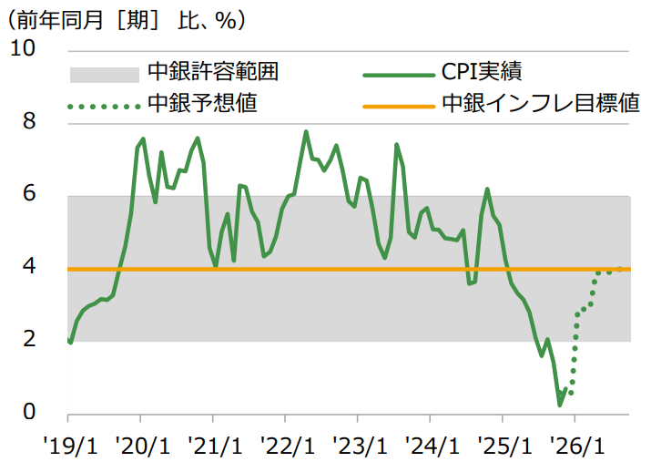 また、金融政策面からもインフレ率の急落は一時的なものだと捉えることができる。金融政策は利下げ局面にあり【図表7】、インド中銀は2025年12月会合で政策金利(レポ)を5.25%へ25bp引き下げ、2026年も金融緩和の余地を残していると言及している。金融政策は利下げ局面にあり、インド中銀は2025年12月会合で政策金利(レポ)を5.25%へ25bp引き下げ、2026年も金融緩和の余地を残していると言及している。金融緩和によって市場に出回る金が増えることで消費が刺激され、インフレ率が回復すると考える。