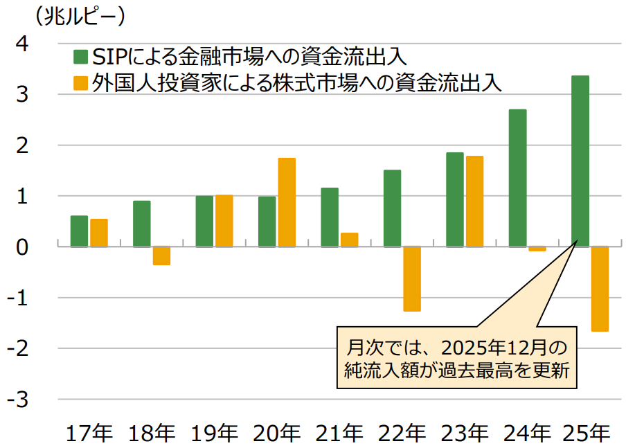 - 下支え要因:下落の下支え要因として、国内投資家(DII)の存在がある。年初来ではFIIが売り越し約4.37兆ルピーに対しDIIの買い越しは約6.98兆ルピーであった。この背景にはSIP(投信積立)による定常フロー(2025年SIP流入2.89兆ルピー)がある。