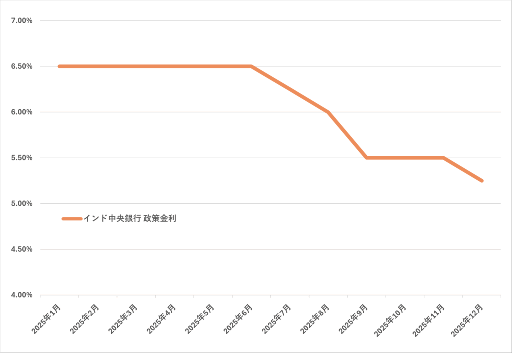 - インドのマクロ経済:実質GDP成長率は+7.4%、CPIは2025年10月0.25%まで低下したものの、12月1.33%と持ち直し、政策金利も2025年12月会合で5.25%へ利下げ、失業率も4.8%(11月4.7%)で急悪化は見られないことから、景気後退が起こっているとは考えづらい。よって、現在の下落は「一時的な調整」であると考察できる。