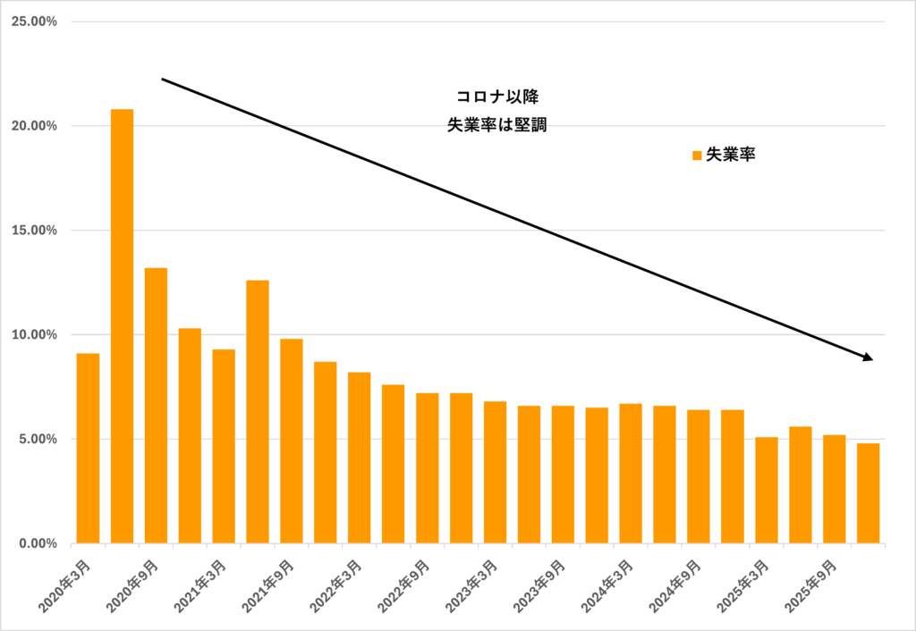 雇用についてはどうだろうか。政府発表の月次データによると、失業率(15歳以上)は2025年12月4.8%(11月4.7%)で概ね横ばいであり昨年と比較しても急速な悪化は見られない【図表8】。つまり、少なくとも“雇用が急に悪化して景気後退入り”という仮説は正しくないように感じる。